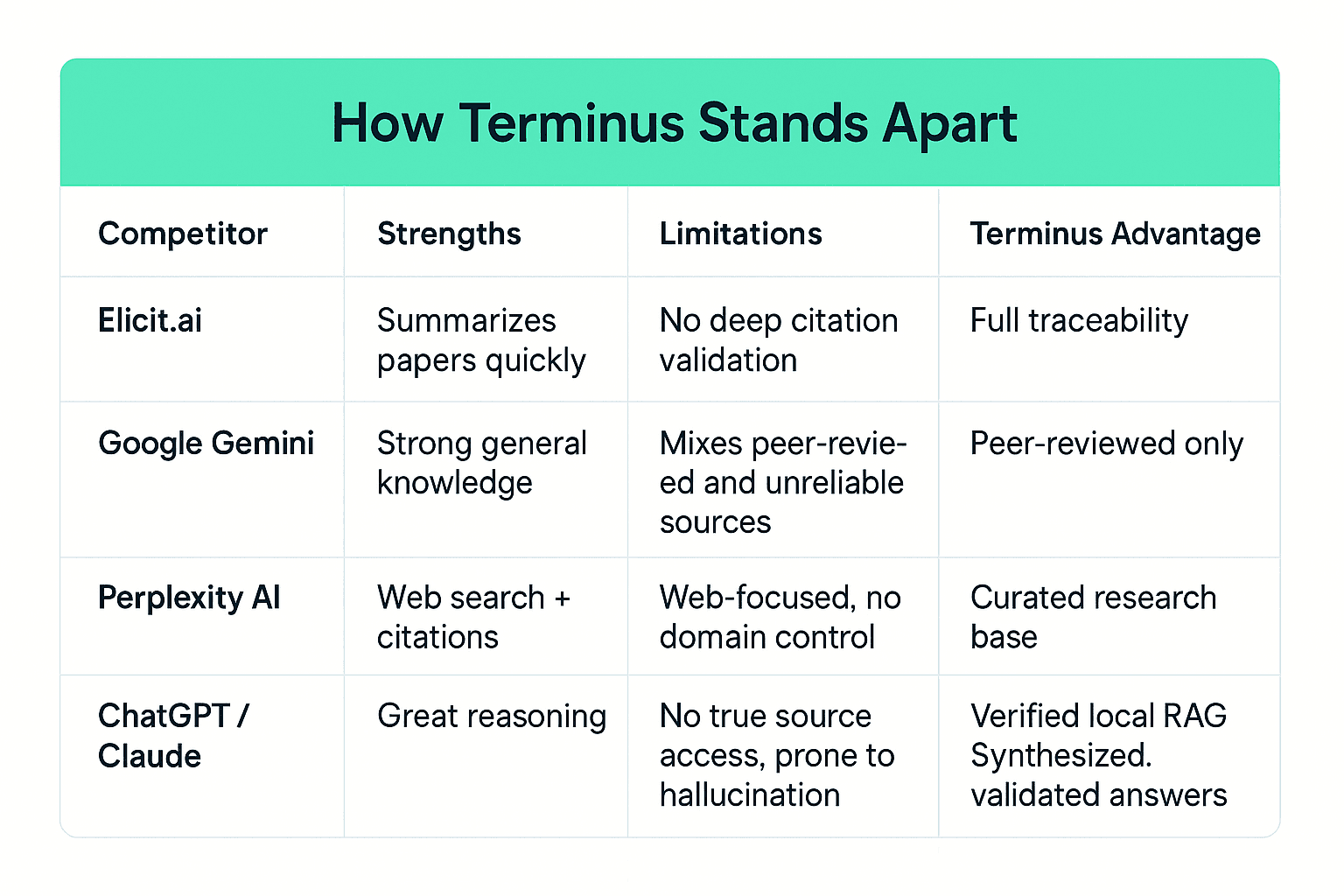 Unlike generic AI assistants, Terminus never fabricates information. Every answer links directly to its original source, complete with author, journal, and year.