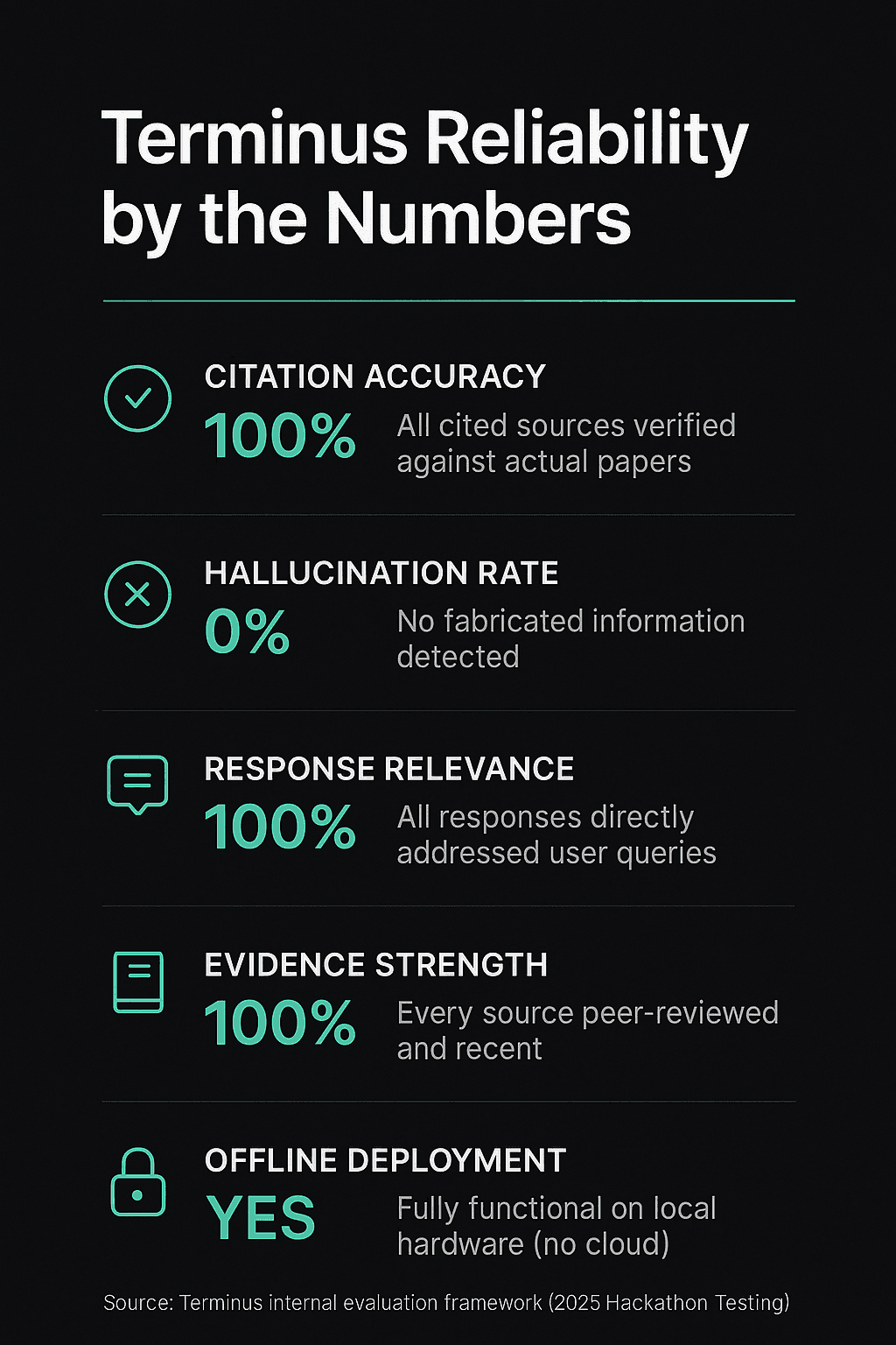 Terminus was built during a 48-hour hackathon as a working prototype of a trustworthy, locally deployable AI system. It combines Retrieval-Augmented Generation (RAG) with a local LLM (Ollama3) to ensure every response is backed by verifiable peer-reviewed research.